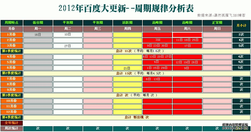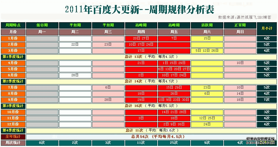 从2011年的数据上看,百度总体的更新时间集中在周四和周五进行周更新,其中周四一年共出现过11次,周五25次,周四和周五总计是36次,占全年54次中的66.7%,近七成的命中率。