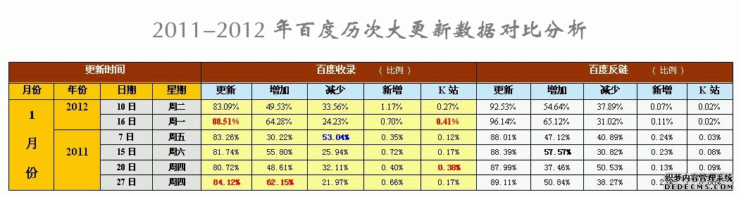 从《2011-2012年百度历次大更新数据对比分析表》中,我们可以看出,每次百度出现大更新时,一般的K站的概率比较低约在0.2%左右,即千分之二的概率。
