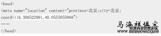 META声明添加放在PC页源代码HEAD标签内部,Name属性的值是location,Content的值为province=北京;city=北京,如下图所示: