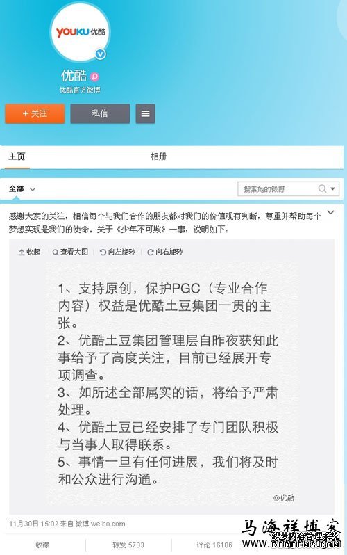 11月30日晚上9点34分,优酷在微博上表示,专门负责此事的副总裁给Niko打电话发短信,但都未能联系到本人。