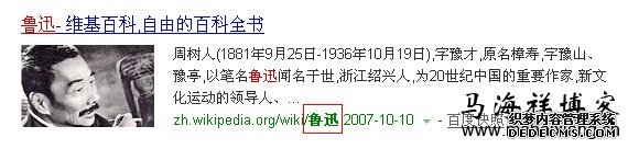 对于路径中包含中文关键词这个现象,大家可能见到的比较少,但并不代表就没有,也不代表没有作用,对此,大家可以在百度里搜索“鲁迅”这个中文词,我们会发现维基百科的文件名是中文的,并且在百度的结果里都加粗了。