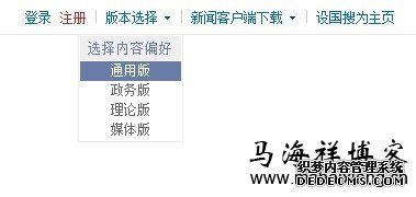 从中国搜索首页的右上角,我们可以看出,这个是默认的通用版,除此之外还有政务版、理论版、媒体版,可以在页面右上角选择。