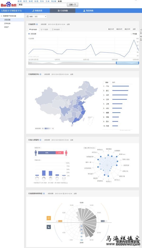 除去之前老版本的基本功能外,行业站长的福利多了,新版中增加了“行业指数”和“我的指数”,方便与各自圈内的兄弟一起探索了。包含行业趋势(WEB端和移动端)、行业地域分布、行业人群属性、行业搜索时间特征。
