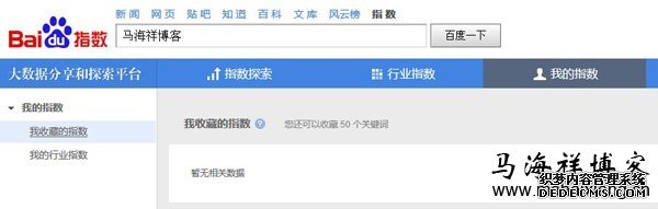 从改版后的百度指数导航来说看,主要由指数探索、行业指数和我的指数三个版块组成,而每一个版块又细分为几个模块。下面我们不妨借助马海祥博客的平台来解读一下本次百度指数改版的点点滴滴吧!