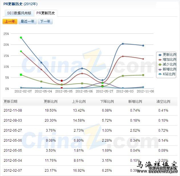 从上图我们可以看出,在2013年的全年中,谷歌的pr值就更新过2次,第一次是在2013年2月5日,最近一次就是在今天2013年12月7日。在本次的谷歌pr更新中,更新比例达到了33.16%,上升的比例占了22.21%,下降比例占了10.95%,新增比例占了13.08%,清空比例占了1.20%,可以说,这次的更新是最近2年内更新比例最大的一次了,这也可能是因为今年谷歌pr更新次数比较少的原因。