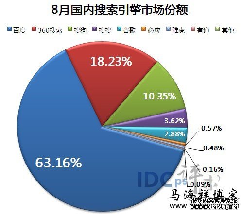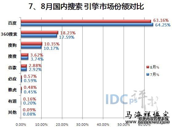 从上图我们可以清楚看到,百度的降幅最为明显,其份额从7月份64.25%到8月份下降至63.16%,下降了1.09%。而涨幅最大的则是360搜索,从17.59%上涨至18.23%,上涨了0.64%;其次是搜狗,上涨了0.18%。