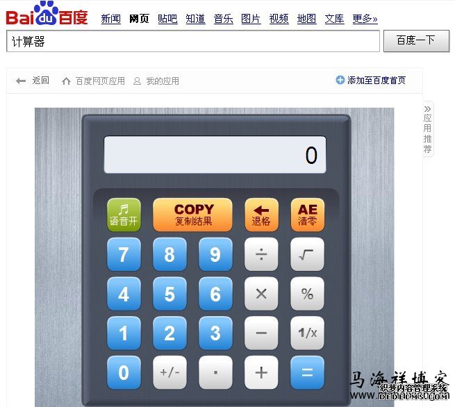 相信第一次听到百度轻应用这个词时,大家脑海中都会浮现一个问题:百度轻应用是什么?据百度官方对百度轻应用的定义为:轻应用是无需下载、即搜即用的全功能App,基于搜索的检索与智能分发特性,解决了移动用户需求与开发者对接的问题。有了百度轻应用,用户不再需要下载大量应用类客户端,只需要一个搜索引擎即可。如:在pc(平板电脑)平台上搜索计算器,即可在搜索结果中显示出可直接计算的软件(如下图)。以后也可能全面发展成用户在手机百度上输入“从北京故宫到长城”,不再需要打开百度地图,即可看到地图和路线。