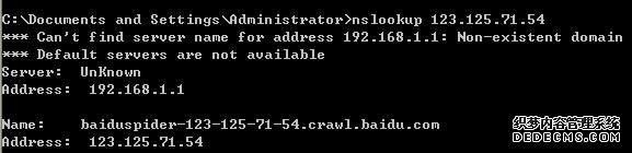 马海祥也为大家分享一个自己的小方法,我们可以打开命令窗口,在窗口中执行nslookup+这一个所谓蜘蛛的地址。加入是货真价实的蜘蛛,那么就会有自己的服务器,反之则是无法找到信息。