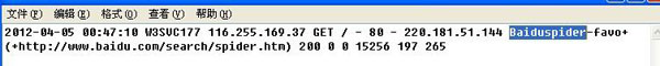 我们可以记事本的方式打开我们站点的日志文件,使用记事本的搜索功能搜索百度和谷歌的蜘蛛,分别是BaiduSpider和Googlebot(更多的搜索引擎蜘蛛标识可通过马海祥博客的《解读IIS日志中搜索引擎蜘蛛名称代码及爬寻返回代码》相关介绍来查询)。