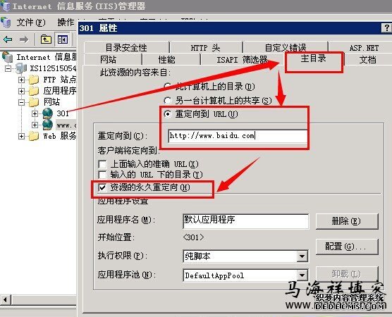 ①、打开internet信息服务管理器,在欲重定向的网页或目录上按右键;