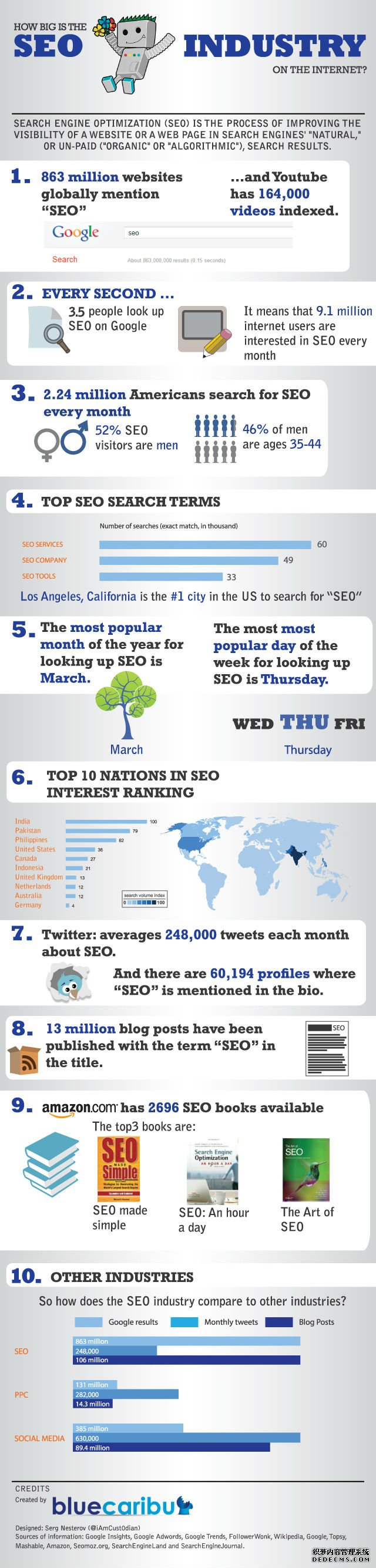 由上面的信息图标数据显示,在Google上,平均每秒钟就有3.5个人在搜索术语”SEO“,每个月,有910万互联网用户在研究SEO,挖掘信息。人们通过很多方式来了解SEO方法。在互联网上,有8.63亿个网站中含有SEO一词,Youtube上164000个视频的标题中都含有”SEO"。洛杉矶可能是美国搜索SEO最多的城市了,但是对SEO最感兴趣的国家要数印度,其次是巴基斯坦和菲律宾,美国排在第四,第五则是加拿大。另外一个与SEO相关的趣事是,三月份是使用搜索最多的月份,星期四则是每周搜索次数最多的日子。