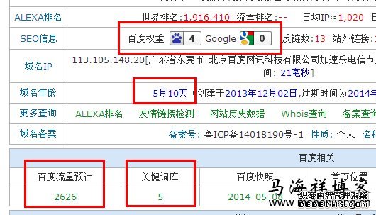 由下图我们可以看出此网站运营也不过才5个月左右,谷歌的pr值还是0,但百度的权重却已经是4了(不明白权重的博友可查看一下马海祥博客的《百度权重是什么》相关介绍),有指数的关键词排名也不过才5个,可百度流量预计却是2626,这也难怪很多人为此感到诧异呀!
