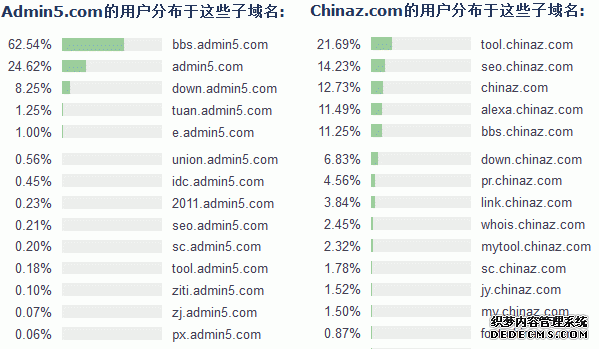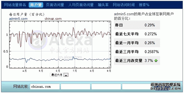 通过上图我们看到Chinaz要高于Admin5,主要和两家的用户群有关,Admin5大多为草根站长;Chinaz不仅有站长,还有IT从业人员、设计师、程序员,我有许多朋友都会到Chinaz下素材和源码,在下面我会详细提到。