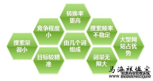 网站上非目标关键词但也可以带来搜索流量的关键词,称为长尾关键词。长尾关键词的特征是比较长,往往是2-3个词组成,甚至是短语,存在于内容页面,除了内容页的标题,还存在于内容中。搜索量非常少,并且不稳定。长尾关键词带来的客户,转化为网站产品客户的概率比目标关键词高很多。存在大量长尾关键词的大中型网站,其带来的总流量非常大。长尾关键词基本属性是:可延伸性,针对性强,范围广。
