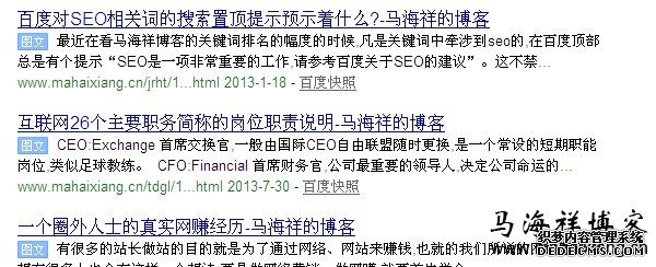 对于以上的五点,可能给大家印象最深的就是展示图文标识的了,以前我们就知道如果文章内容图文并茂,效果会更好,百度也喜欢。图文并茂不仅可以促进收录,提升质量,还且还大大满足用户体验。现在百度正式把图文形式用到搜索中,不仅表明了对用户体验的重视,同时马海祥还觉得也是在告诉站长们,百度现在会更重视图文并茂的内容,并给予更高的评分。所以说我们现在更需要做好图文并茂的原创文章,因为图文并茂不仅能给网站带来生机,同时在搜索引擎中能引起用户注意,提高点击量。