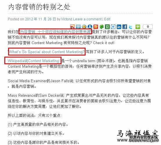 更新/修订内容的一个最简单的方法就是创建和更新链接。重读旧的内容看看你是否已经对在之前发布的内容中提到的主题添加了新内容。比如下面的这个例子,我曾写过有关“内容营销的创意来源”的内容,现在就可以给它加链接。又或者,Wikipedia上有对于内容营销比较详细的解释,现在你就可以把链接添加到原来的资料中。