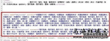 (3)、从最上方开始寻找Title以及meta这两组关键的语法,跟随在这两组语法后就会很明显的看见很多关键词堆栈。