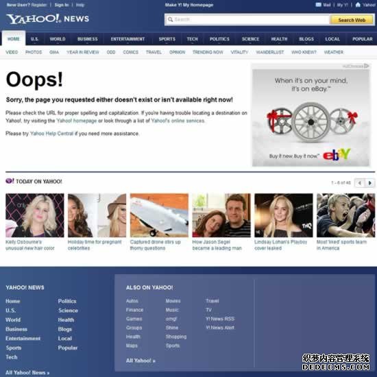 尽管内容很多,但最醒目的位置依然显示错误信息,外贸网站推广提示用户,要访问的页面不存在。然后,上面加入导航,右边放上广告,下面再挤点图文并茂的文章,这还不够,最下面在仍点导航链接进去,用户想不点都不行啊。