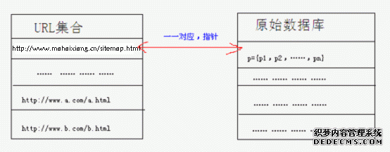 假如蜘蛛爬取的页面的URL是,而搜索引擎在此页面经过上述操作后提取到的关键词集合为p,且p是由关键词p1,p2,……,pn组成,则在百度数据库中,其相互间的关系是一一对应,如下图。