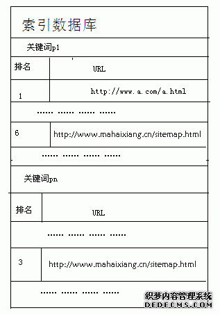 上图是为了方便大家便于理解而做出来的,索引数据库实际上是搜索引擎中对性能要求最高的数据库,因为里面所有因素都会受到算法影响,所以实际上的索引数据库我觉得应该是由多维数组所组成的较为复杂的索引表,但其主要体现的大体作用与上图相同。