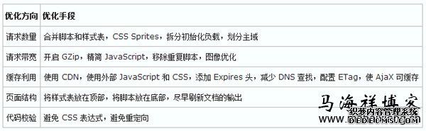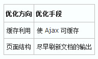 首先,我们把《雅虎十四条:网站前端网页优化的14条原则》中提到的优化点做一次梳理,如果按照优化方向分类可以得到这样一张表格: