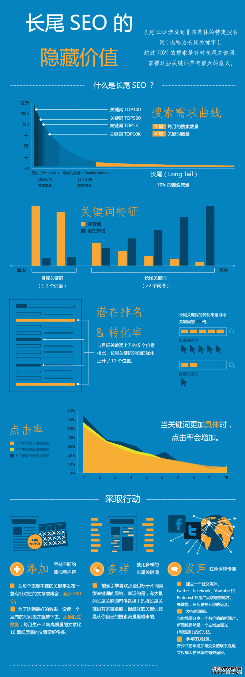 网站上非目标关键词但也可以带来搜索流量的关键词,称为长尾关键词。长尾关键词的特征是比较长,往往是2-3个词组成,甚至是短语,存在于内容页面,除了内容页的标题,还存在于内容中。搜索量非常少,并且不稳定。长尾关键词带来的客户,转化为网站产品客户的概率比目标关键词高很多。存在大量长尾关键词的大中型网站,其带来的总流量非常大。长尾关键词基本属性是:可延伸性,针对性强,范围广。详细的介绍的大家查看马海祥博客上的《什么是长尾关键词?》一文。