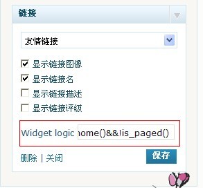 2.插件设置:外观—小工具 小工具的下面会多出一个Widget Logic的扩展项 如果需要设置友链只在首页显示,在输入框输入“is_home()&&!is_paged()”即可。如下图: