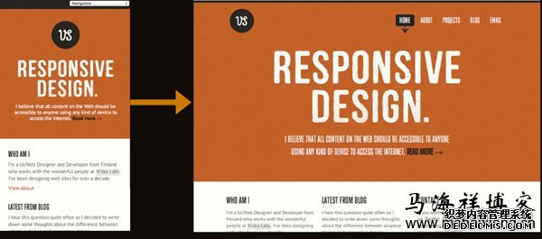 将导航置顶或让导航随布局任意流动(放任自流)是一种最简单的导航实现方式,正是由于这种易于实现的方式,它也成为了当下许多响应式网页的“标配”(具体可查看马海祥博客《什么是响应式网页设计》的相关介绍)。