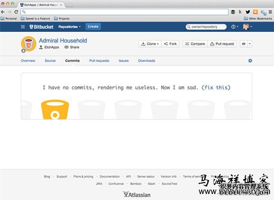 译注:这是Bitbucket的代码提交记录页面,当它为空时,外贸网站营销网站的拟人化形象——一个小桶子用幽怨的口气说道,“我这里没有任何提交记录,这让我显得毫无用处,我感到很难过。”优秀的第一印象不仅仅与可用性有关,它也与产品的调性有关(具体可查看马海祥博客《如何将需求还原成情景变成可用性设计》的相关介绍)。