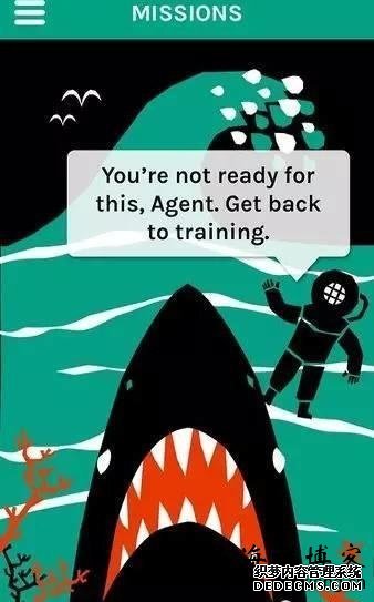 译注:看起来像是一个游戏的任务列表页面,一个潜水员在一条鲨鱼旁边,空白页面设计的思路2015/7/18网页设计说道:“你还没有准备好,指挥官,回去再训练一下吧。”