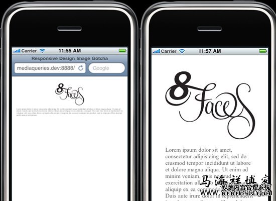 在iPhone及iPodTouch中,页面会被自动的同比例缩小至最适合屏幕大小的尺寸,x轴不会产生滚动条,用户可以上下拖拽浏览全部页面,或在需要的时候放大页面的局部。这里会产生一个问题,即使我们运用响应式Web设计的思想,专门为iPhone的小屏输出小图片,它同样会随着整个页面一起被同比例缩小,如下图左侧所示。