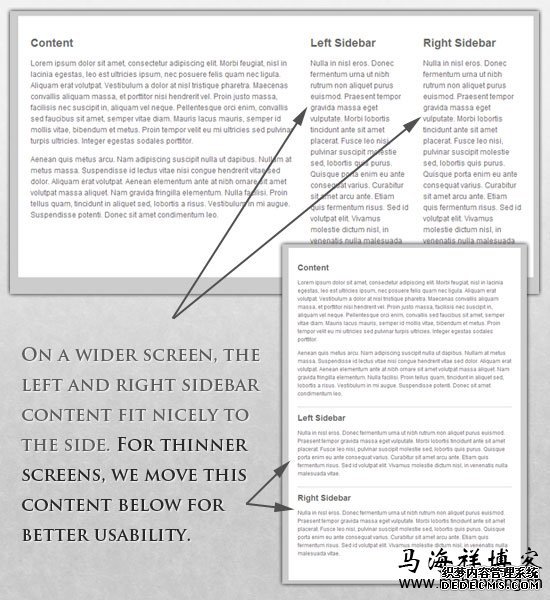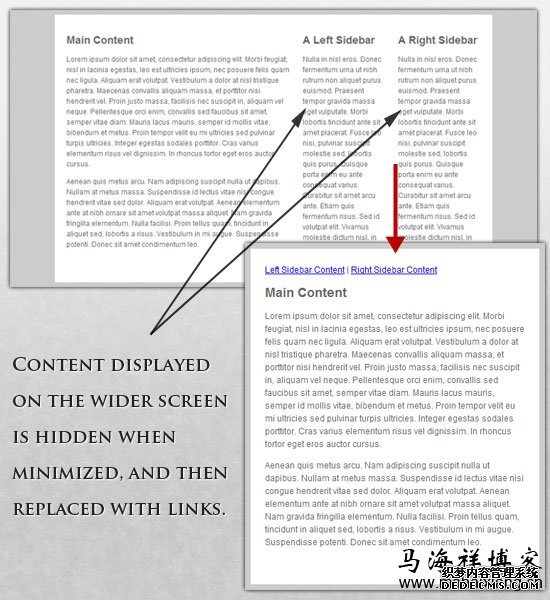 在前文提到的EthanMarcotte的文章中,他通过一个实例展示了响应式Web设计在页面弹性方面的特性,如下图所示: