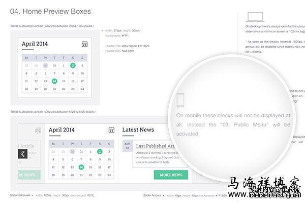从上图中我们可以看出,在设计响应式项目时(具体可查看马海祥博客的《如何制作一个响应式网页》相关介绍),将每个元素的“表现”包含进来是有好处的。再说,通常开发们不会关注这些事情(也不该由他们来关注)。