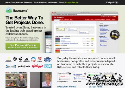 basecamp在这折叠线以上(768px高),网站显示了一个巨大的截图,标语、价值主张、呼吁行动、客户列表、视频以及显示特点的小图。外贸网站推广