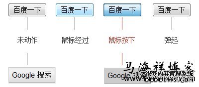 上图中百度一下的鼠标按下状态加深了颜色,google搜索则直接将底色置灰,从视觉上给了浏览者最直观的感受这个按钮我按下了。从而增加了网站是用户体验度。